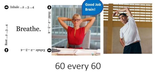 - Every 60 minutes, stand up/stretch/move/close your eyes for 60 seconds